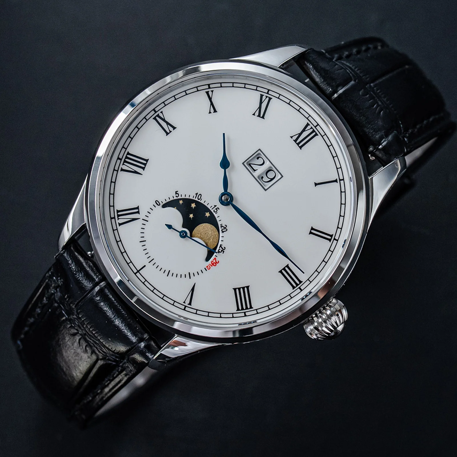 - Features : Enamel Dial (high temperature paint, 100 Years never become yellow), Blue Steel Hands, Index and Moon, 59 teeth gear for 29 ½ MoonPhase, Perlage Movement Polished and Engraving, Exhibition Case Back Cover